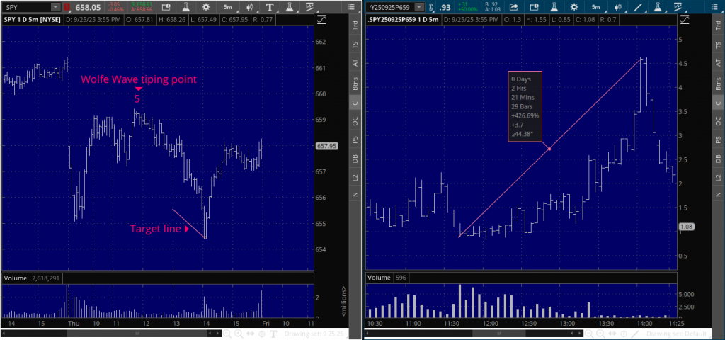 UPDATE: 9/25/25. Perfect ! Thank all you Wolfe Wave Practioners for piling on at the 5, Wolfe Wave tipping point. YOU make my methodology come to life. 426% gain in two-hours for the SPY put option.
