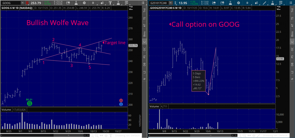 I sincerely thank all my Wolfe Wave Practioners for piling in at the 5 point, the tipping point. GOOG call option up 490%.
